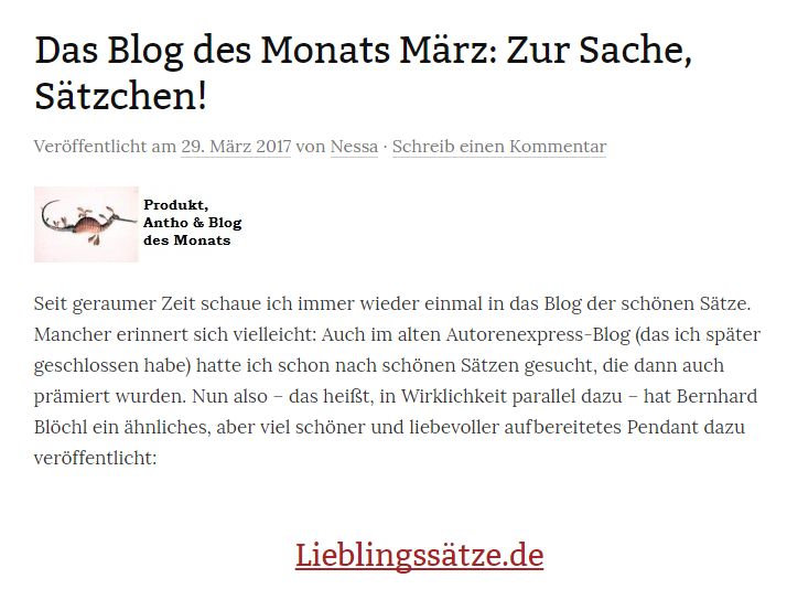 Hurra, das Museum der schönen Sätze ist Blog des Monats beim Autorenexpress. Aus diesem Anlass habe ich Nessa Altura ein paar Fragen über „Zur Sache, Sätzchen!“ und mich beantwortet. Danke dafür! Hier geht’s zum Beitrag. Weiterlesen