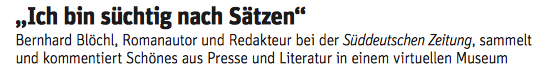 Im Sommer 2011 hat der Journalist und Schriftsteller Bernhard Blöchl ein digitales Museum für Lieblingssätze ins Leben gerufen. Dort sammelt und kommentiert er seitdem schöne Aussagen. Via Facebook kann beim Publikumsvoting über die Zeilen abgestimmt werden. „Jeder Tag ist ein Geschenk, er ist nur scheiße verpackt, und man fummelt am Geschenkpapier rum und kriegt es nur mühsam wieder ab.“ Das ist einer der schönsten Sätze des Jahres 2012, die die Facebook-User auf Platz eins ins Netz-Museum der Lieblingssätze gewählt haben. Verfasst von Kid Kopphausen, ein Pseudonym, hinter dem sich Gisbert zu Knyphausen und der zu früh verstorbene Nils Koppruch verbargen. Ausgewählt und kommentiert hat diesen Satz für sein digitales Museum der Autor Bernhard Blöchl.