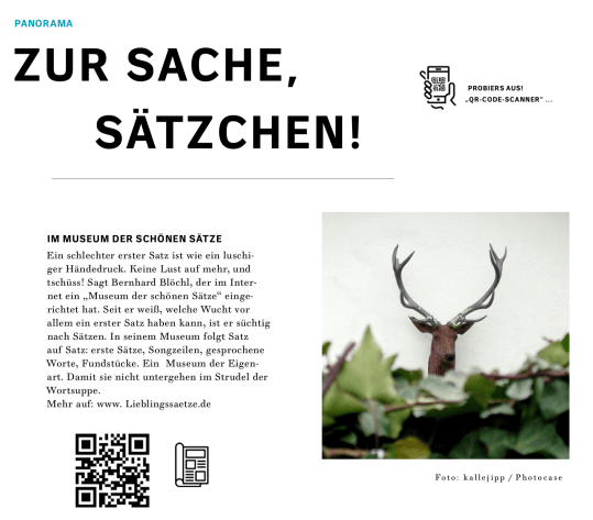 Hurra, die geschätzten Kollegen mögen Lieblingssaetze.de! Die Freie Presse in Chemnitz hat mit dem Kurator Bernhard Blöchl vor kurzem ein seitengroßes Interview geführt. In dem schönen, verschmitzten und kritischen E-Mail-Austausch mit Katharina Leuoth geht es um die Essenz brillanter Textanfänge, die Entstehung des Museums und um ärgerliche Schreibfehler. Den ersten Satz meines kommenden zweiten Romans hat mir die Redakteurin ebenfalls entlockt.